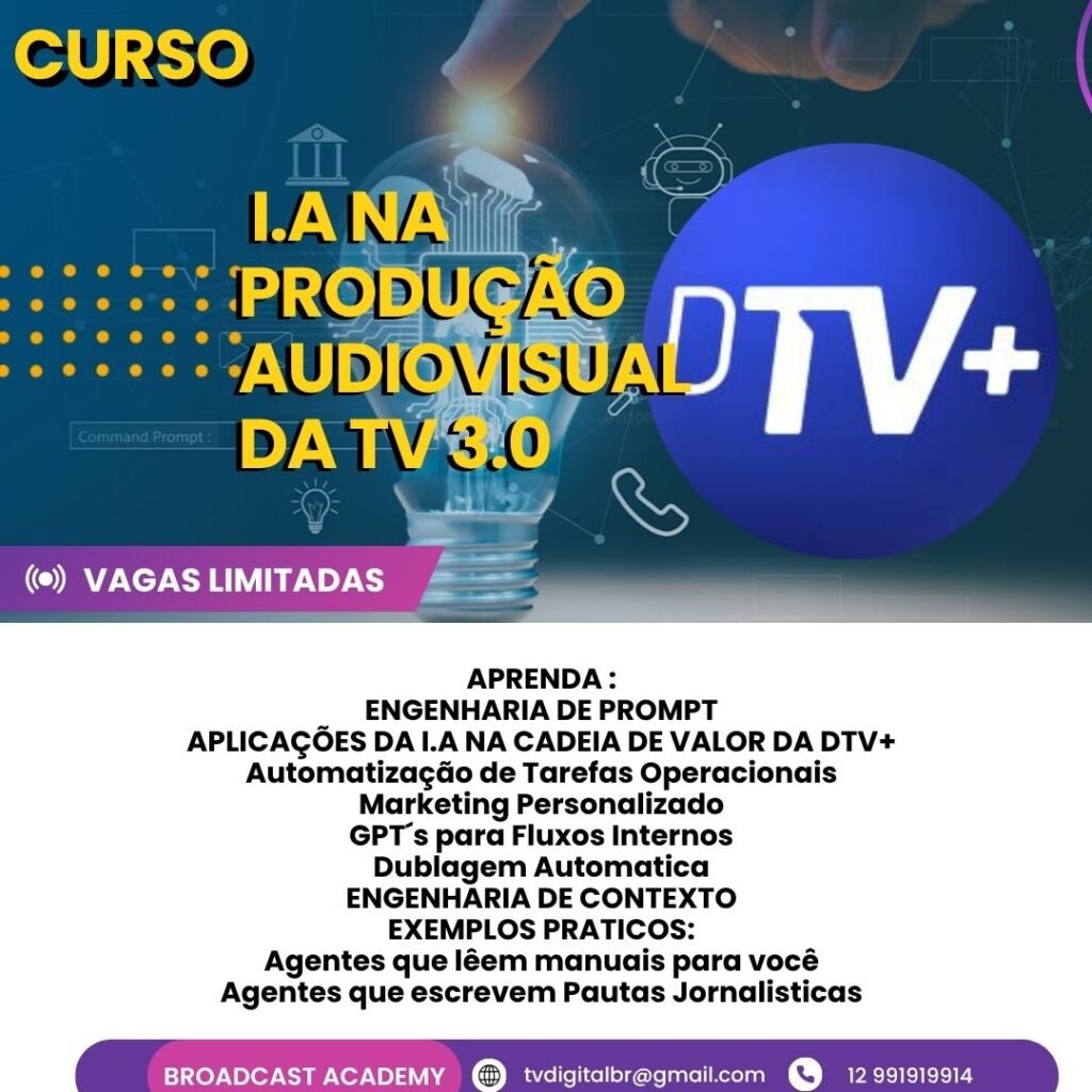 Durante quatro horas de imersão ao vivo, o participante percorre os eixos da transformação digital no audiovisual: automação de fluxos, marketing com agentes inteligentes, engenharia de prompt, dublagem automática e uso de GPTs em ambientes de produção. O curso apresenta o que já acontece em emissoras, estúdios e startups de mídia e mostra como o profissional pode ocupar esse espaço com visão e domínio técnico.