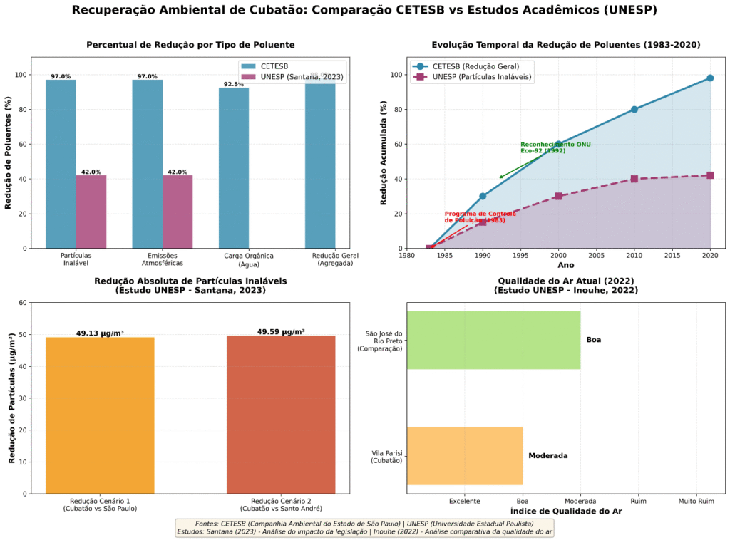 A professora Elisa Esposito, da Universidade Federal de São Paulo, afirma que Cubatão pode ser considerada modelo de recuperação ambiental. No entanto, observa que o dado de 98% de redução, frequentemente citado em fontes jornalísticas e pela CETESB, deve ser contextualizado. Segundo ela, estudos acadêmicos mais recentes encontram reduções na faixa de 42% a 49% para partículas inaláveis específicas, dependendo do período e do poluente analisado.