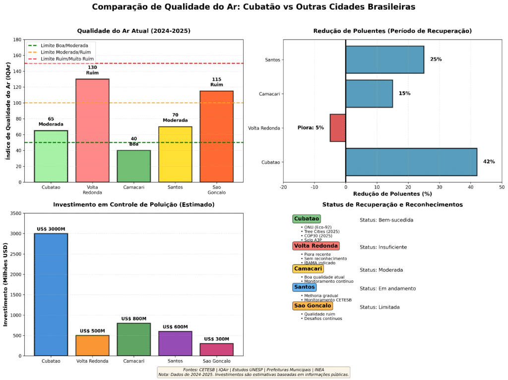 Em comparação com municípios industriais como Paulínia e Volta Redonda, Cubatão apresenta indicadores semelhantes para material particulado fino (PM10 e PM2.5), segundo relatórios estaduais e federais de monitoramento atmosférico.