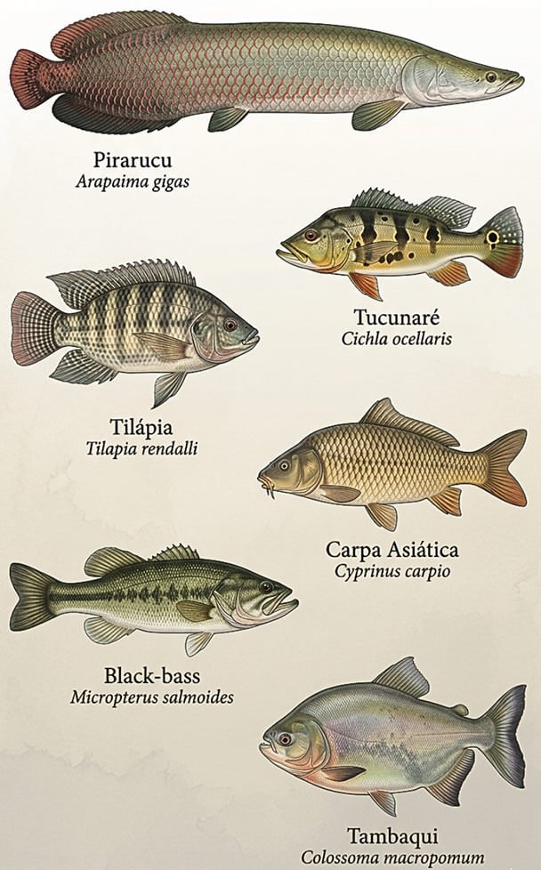 Entre março e dezembro de 1960, menos de um ano após o enchimento do lago, o governo lançou nas suas águas 145 mil tilápias do Congo, 6,5 mil exemplares de black-bass, 7 mil bluegills e ainda mandis e piaparas amazônicas. Nas décadas seguintes vieram carpas asiáticas, tucunarés e tambaquis. Cada espécie chegou com uma justificativa: enriquecer a pesca, alimentar famílias, atrair turistas. Nenhuma chegou com um plano para o que viria depois.