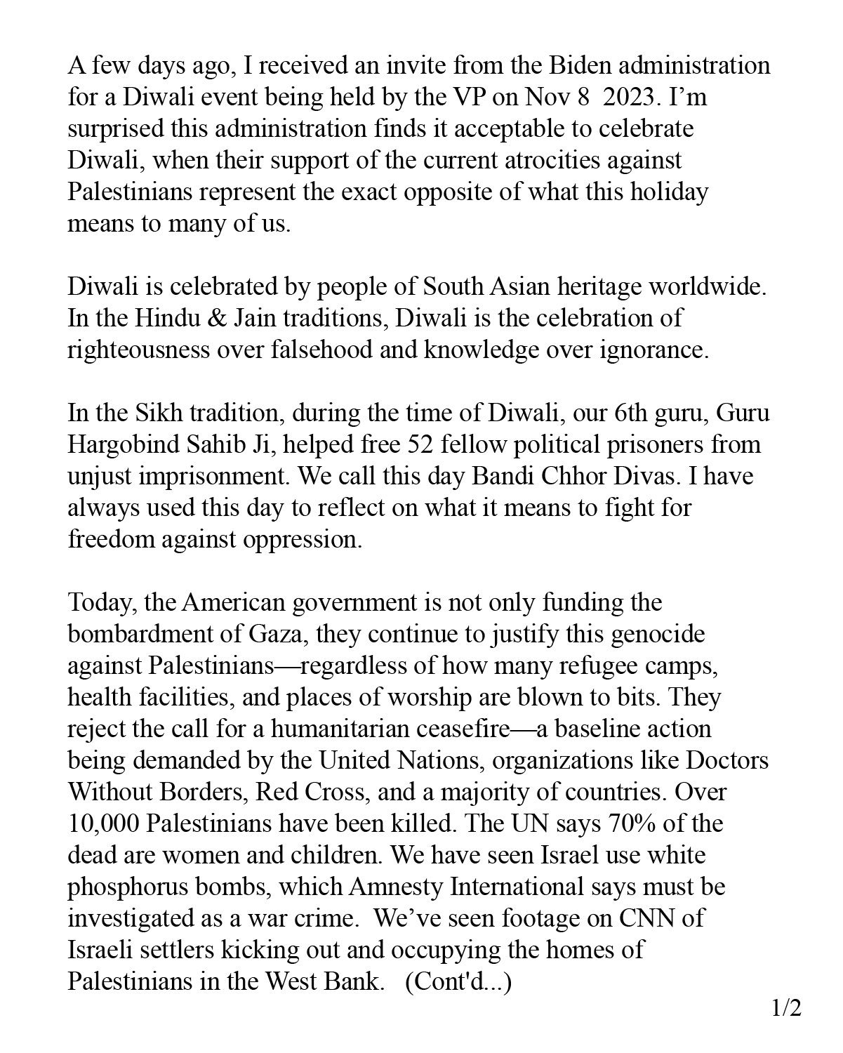 Na carta, Kaur deixou claro que não permitirá que sua imagem seja usada para limpar as ações da administração Biden. Ela enfatizou seu compromisso em não participar de um evento realizado por uma administração que apoia violações dos direitos humanos e contribui para a tragédia em Gaza.
