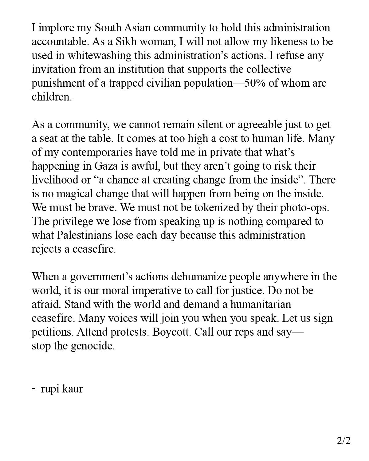 No entanto, Rupi Kaur, em sua carta pública, expressou seu repúdio ao apoio dos Estados Unidos aos bombardeios à Faixa de Gaza perpetuados por Israel. A poeta destacou o veto da diplomacia de Joe Biden no Conselho de Segurança da ONU a um cessar-fogo humanitário, e mencionou os mais de 10 mil palestinos mortos por Israel desde o início da guerra à Gaza, chamando a campanha de “atrocidade contra os palestinos”.